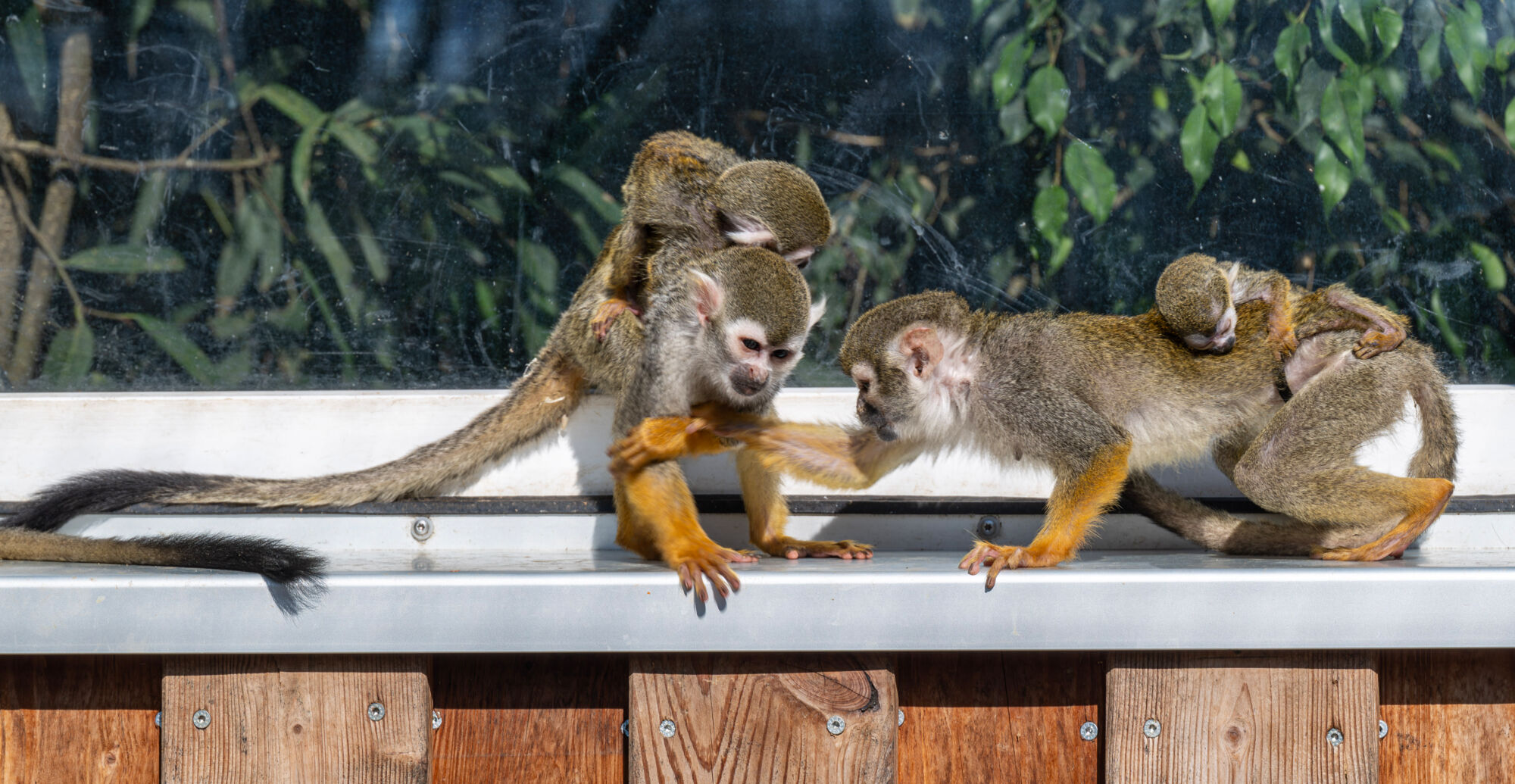 Auch bei den Totenkopfäffchen sind schon einige Jungtiere zu sehen. Drei kleine Babys klammern sich auf dem Rücken ihrer Mutter fest, mindestens noch ein weiteres Jungtier ist zu erwarten. Anders als bei den Ziegen werden die Kleinen hier aber noch einige Zeit vor allem schlafend auf dem sicheren Rücken der Mutter verbringen, bevor sie neugierig beginnen, die Welt zu erkunden.
